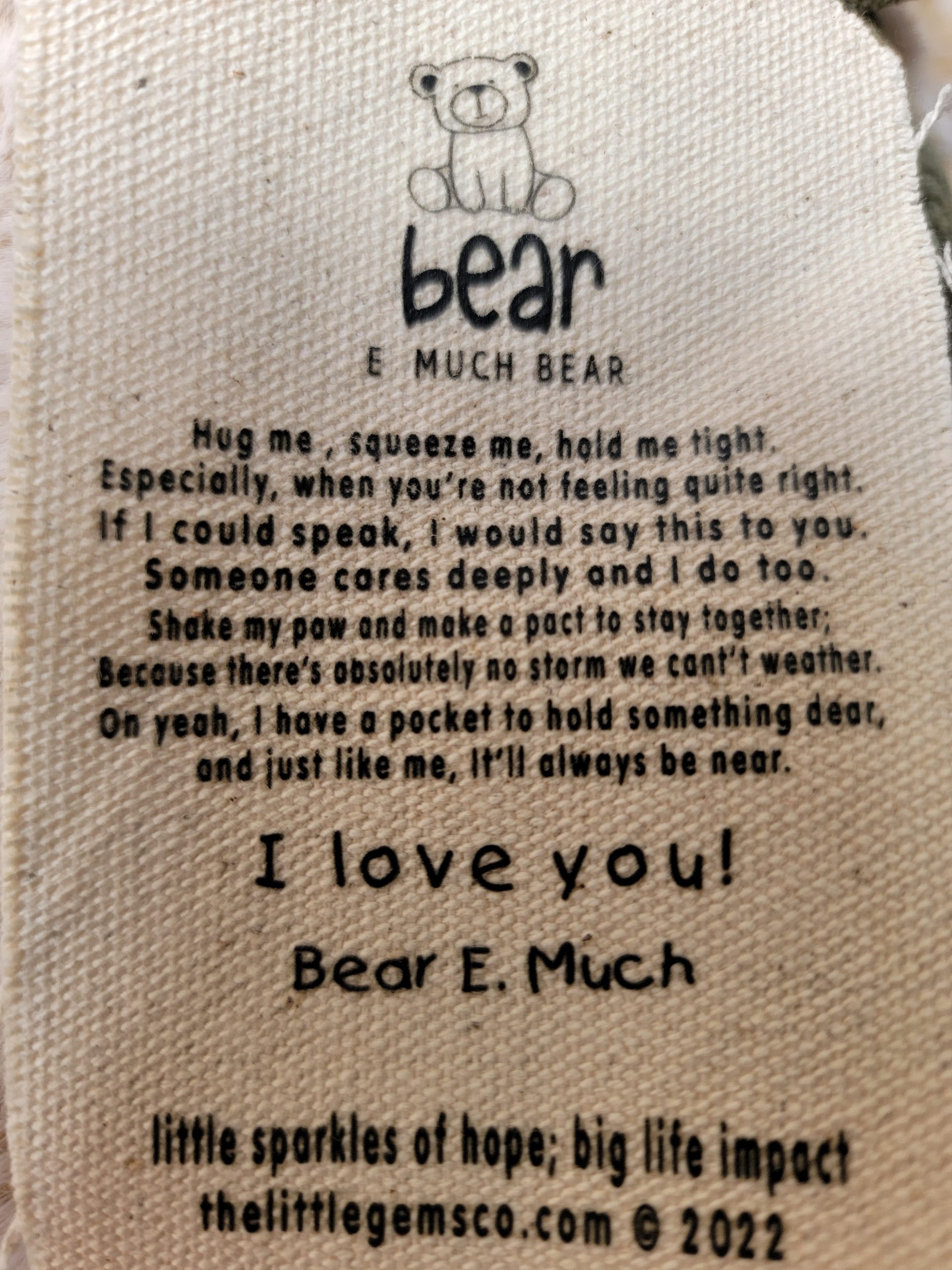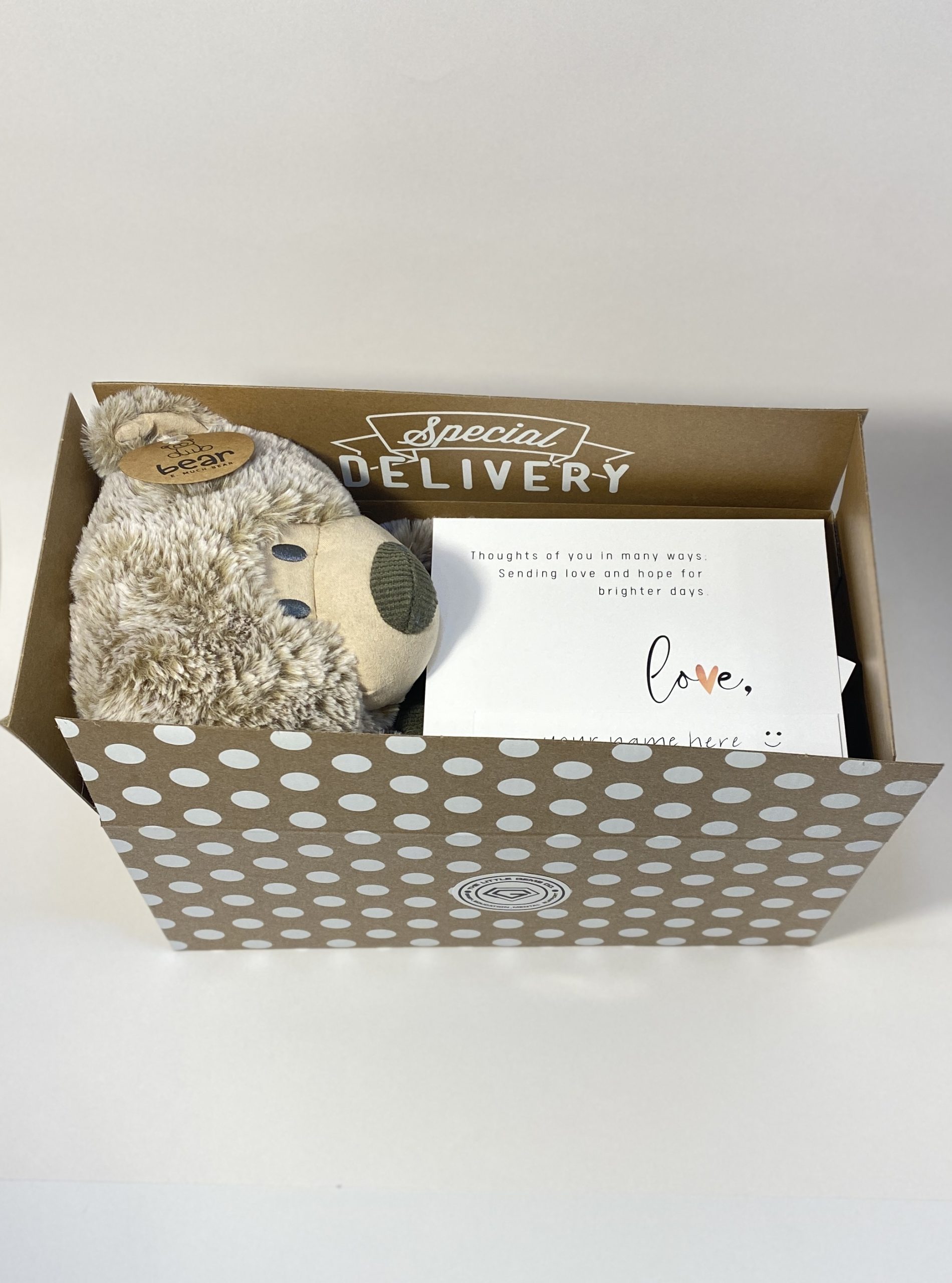 Brighten someone’s day with a thoughtful and meaningful gift that includes our Bear E. Much Bear with his personal message tag, his Pinky Paw Promise Card, and a standard greeting card with your name on it.